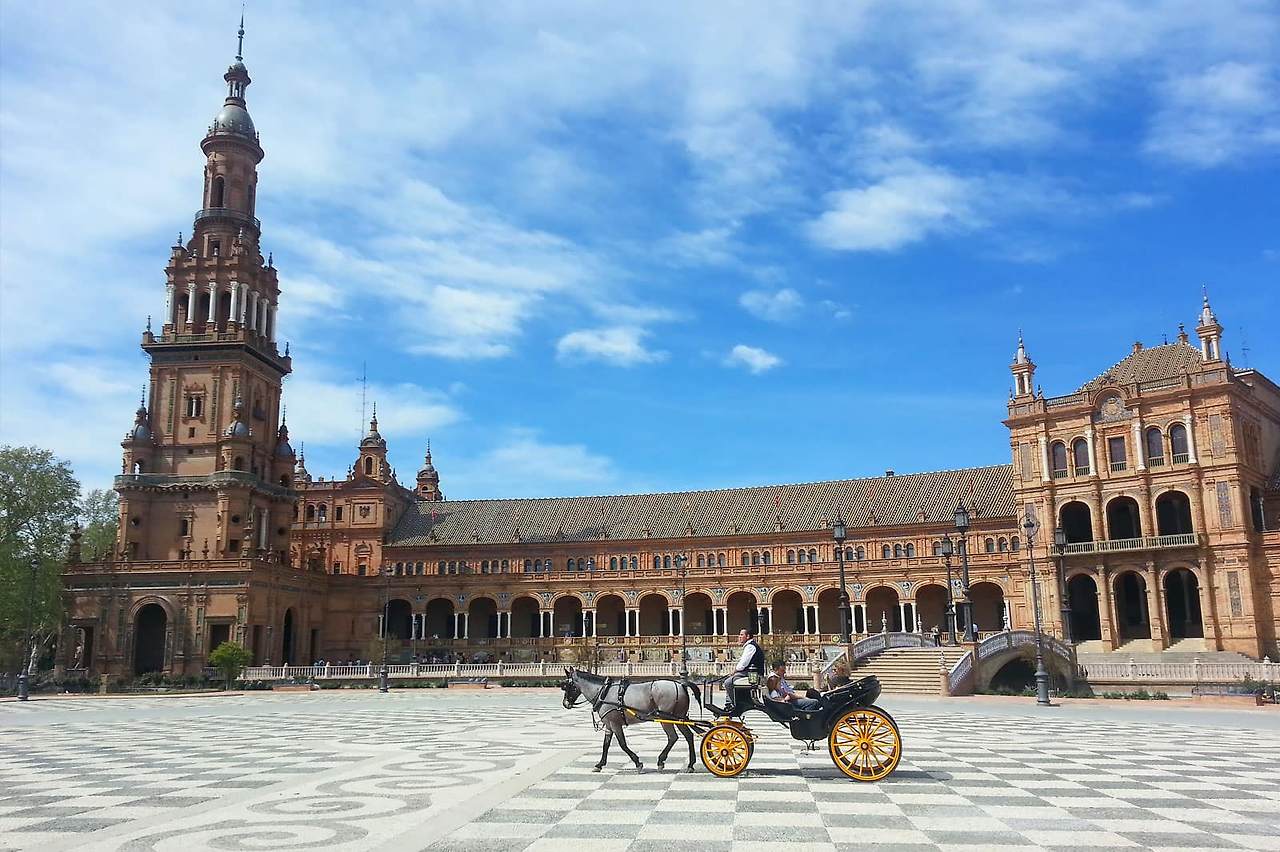 에스파냐 광장은 세비야 중심부의 아름다운 랜드마크예요. 20세기에 도시의 건축 양식을 반영하여 지어진 이 광장은 그 규모가 매우 인상적입니다. 광장을 가로지르는 분수대와 그늘이 드리워진 파빌리온이 있는 수경시설이 있습니다. 스페인 광장이 낯설게 느껴진다면 스타워즈와 아라비아의 로렌스 등 여러 영화에 등장했던 곳이기 때문일 거예요.