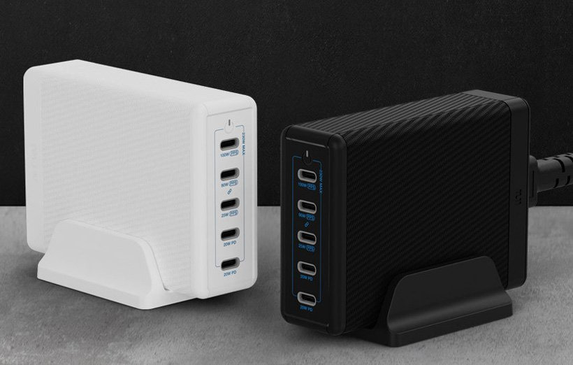 버바팀의 멀티충전기는 최대 156W의 출력을 지원하 는 제품이다. PD 충전을 지원하는 C타입 포트 두 개에 QC3.0의 18W 포트 두 개까지 총 네 개의 포트를 갖추 고있다. 2포트 동시 사용 시 최대 120W의 출력으로, 노트북을 동시에 두 대 충전할 수 있다. PPS 20V 5A를 지원해, PPS 초고속 충전도 완벽하게 지원한다. QC 2.