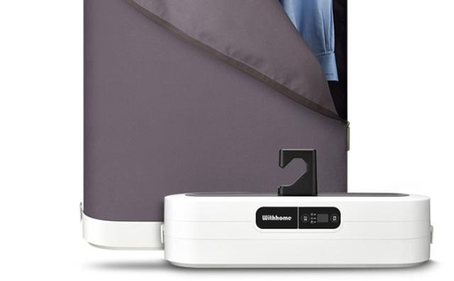 위드홈의 의류관리기는 스마트 행어와 진동 케어로 의류를 관리할 수 있는 제품이다. 프리미엄 패브릭 재 질의 제품으로, 접어서 휴대할 수 있으며 거치형으로 도 튼튼하게 사용할 수 있는 제품이다. 스마트 행어는 바람만으로는 털기 힘든 미세한 먼지를 털어내기 위 해 분당 최대 140회 진동한다. 살균을 위해 UVC-LE