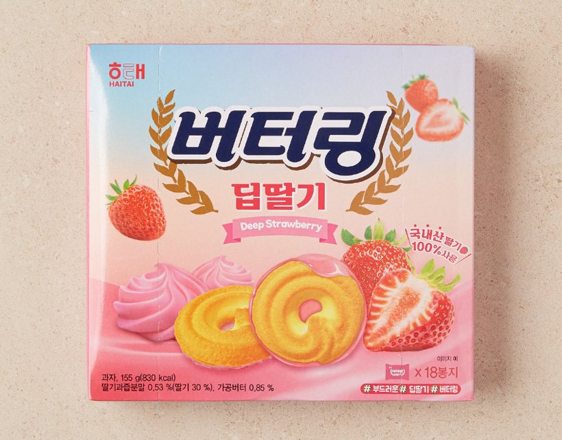버터링은 1981년부터 해태제과에서 판매하고 있는 버터쿠키 타입의 과자다. 중장년층에게 추억의 과자인 이 제품은 지금까지도 새로운 맛의 신제품이 꾸준히 출시되고 있다. 버터링 라인업 중에는 깊은 맛을 느낄 수 있는 딥초코, 딥카페 등의 ‘딥 시리즈’가 있는데, 이 시리즈의 최신 제품으로 출시된 것이 ‘딥딸기’다. 국내산 딸기를 사용해 부드럽고 달콤한 딸기의 풍미를 즐길 수 있는 제품이다. 본 제품의 판매가는 3,980원이다.