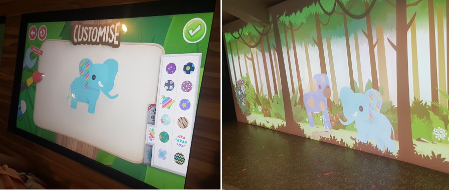 숲 속 장면을 묘사한 대형 스크린이 있는 인터랙티브 전시 공간인 '숲 속에 누가 있을까'도 있습니다. 아이들이 디지털 태블릿에 동물을 그려서 숲에 생명을 불어넣을 수 있어요. 마치 마법처럼 이 동물들이 화면에서 살아 움직일 거예요.