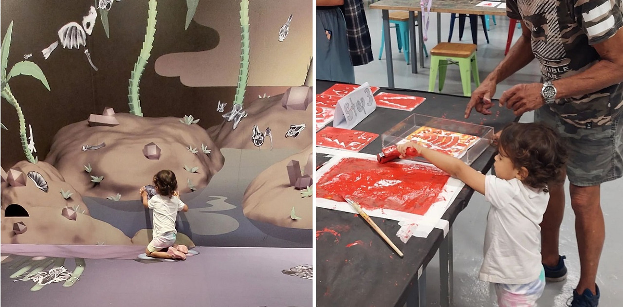활기찬 공간 곳곳에서 아이들은 잉크, 붓 및 기타 도구를 사용하여 예술 작품을 만드는 방법에 대한 워크숍에 참여하거나 벽화의 동물 모양 자석을 가지고 놀면서 자신만의 이야기를 만들 수 있습니다.