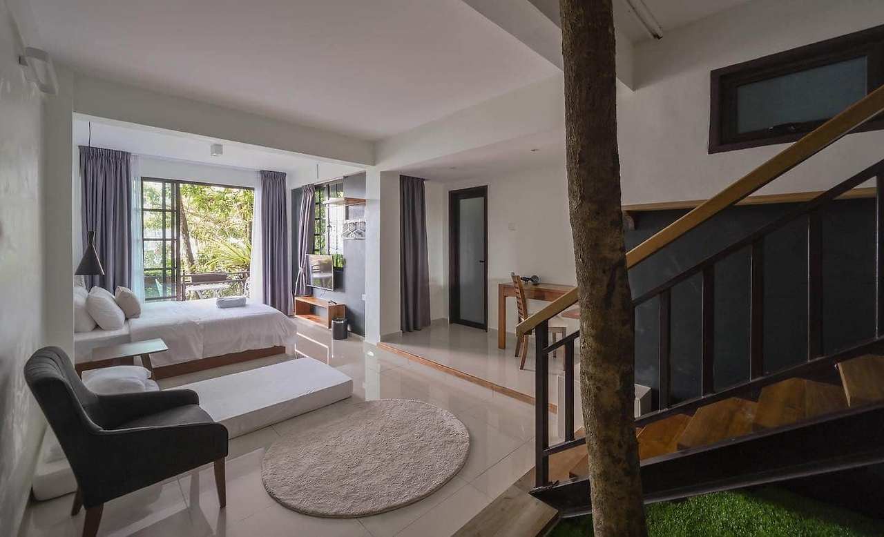 더 듀플렉스 스위트는 메자닌 층에 슈퍼 킹 사이즈 침대가 있는 넓은 객실이며,1 층에는 라운지와 간이 주방이 있습니다. 또한,수페리어 룸은 녹지가 내려다 보이는 발코니까지 열리는 슬라이딩 도어가 있는 킹 사이즈 침대를 갖추고 있습니다.