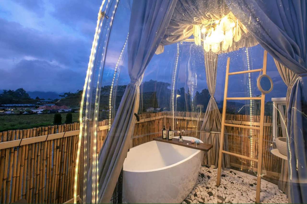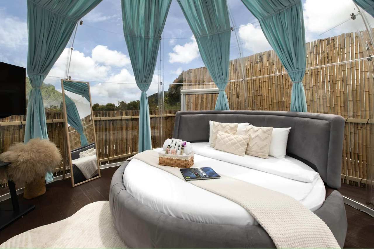 말레이시아에서 최초로 만들어진 독특한 카라반 방 외에도,그들은 투명한 거품 돔 안에 퀸 사이즈 침대가 있는 고급스러운 스타룩스를 가지고 있습니다. 988 원/박,당신은 당신의 침대에서 또는 욕조에서 별을 관찰,돔 내부 밤을 보낼 수 있습니다.