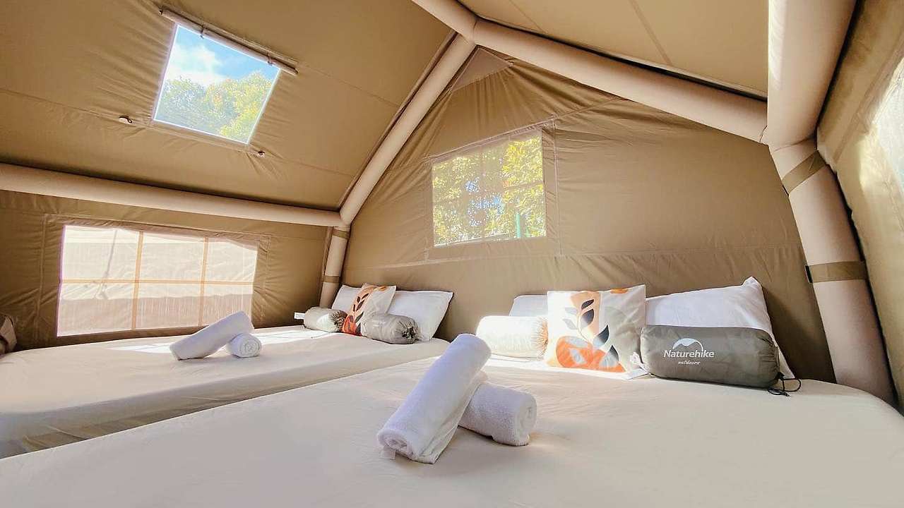다른 편안한 숙박 시설에는 가장 큰 글램핑 텐트인 코티지가 있습니다. 침실에는 퀸 사이즈 침대 2 개와 별도의 거실이 있으며,방이 있는 프로젝터를 최대한 활용할 수 있습니다.