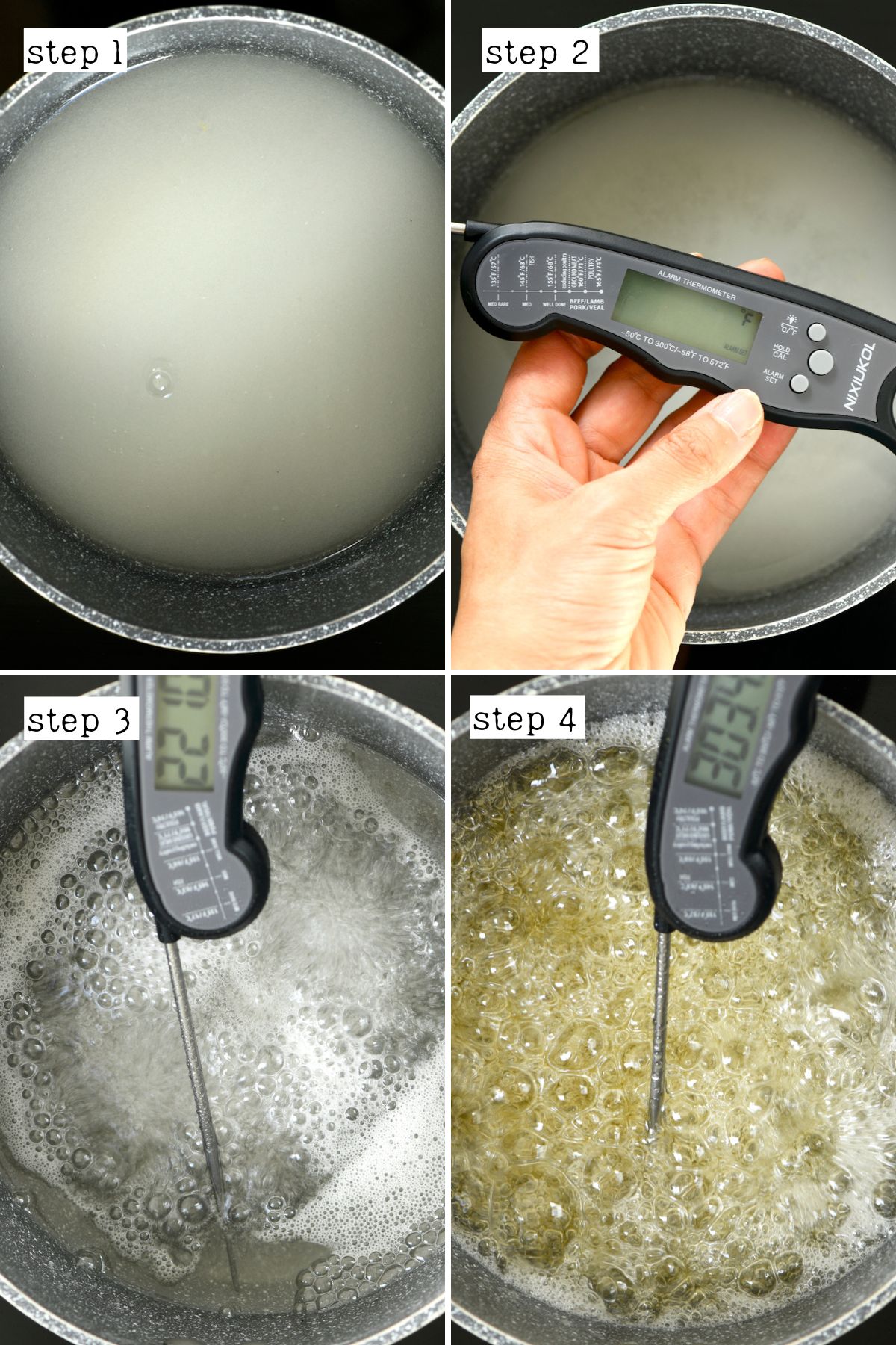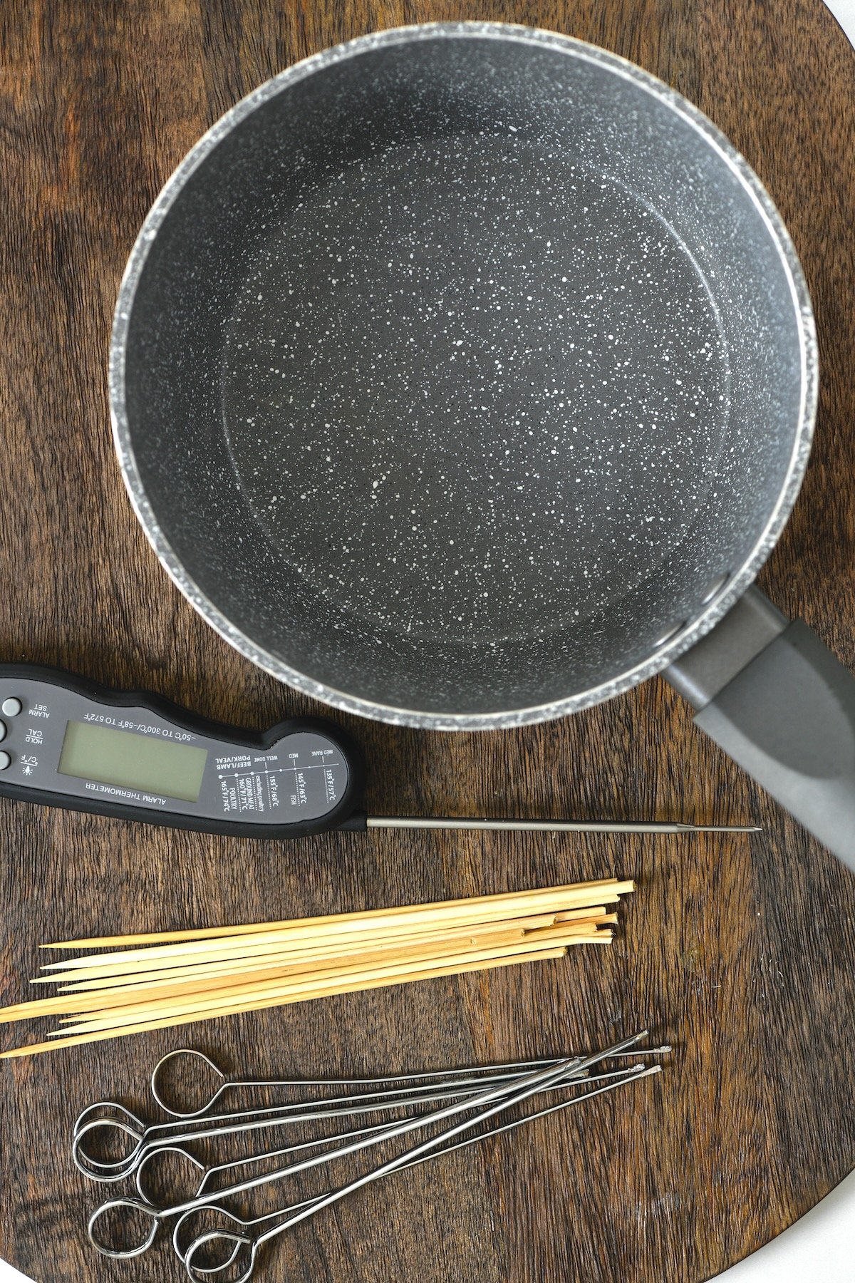 사탕 온도계 또는 기타 좋은 음식 온도계와 꼬치(금속 또는 대나무 꼬치)도 필요합니다.