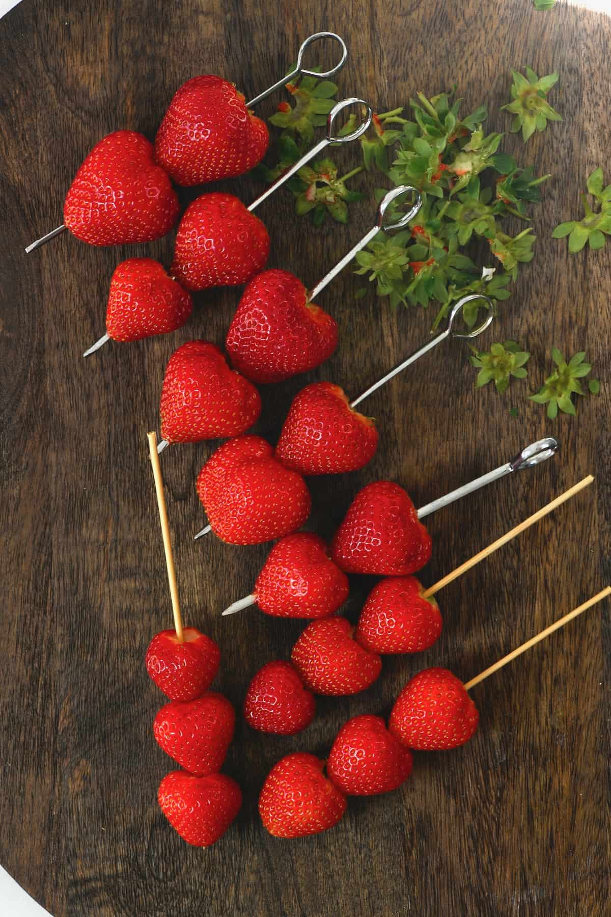 그런 다음 꼬치에 딸기를 배열하십시오-작은 열매를 사용하는 경우 하나 또는 여러 개를 추가 할 수 있습니다.