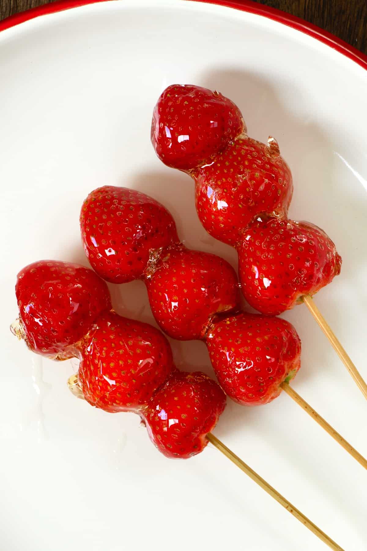 설탕 시럽이 필요한 온도에 도달 한 후 냄비를 열에서 제거하십시오. 꼬치 중 하나를 가지고 혼합물에 딸기를 빨리 담그십시오. 그들이 모두 코팅되어 있는지 확인하십시오.