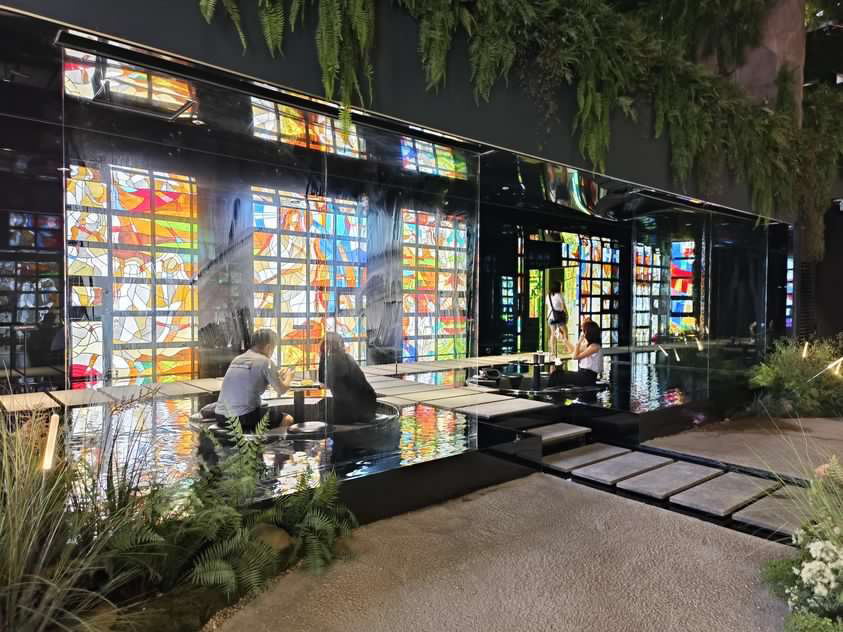 오래된 교회를 카페로 리모델링한 공간으로 창문이 스테인드글라스로 되어 있어 파리 성당의 분위기를 느낄 수 있고, 주변에 큰 나무와 푸른 식물들이 인테리어를 더욱 아름답게 만들어 줍니다.