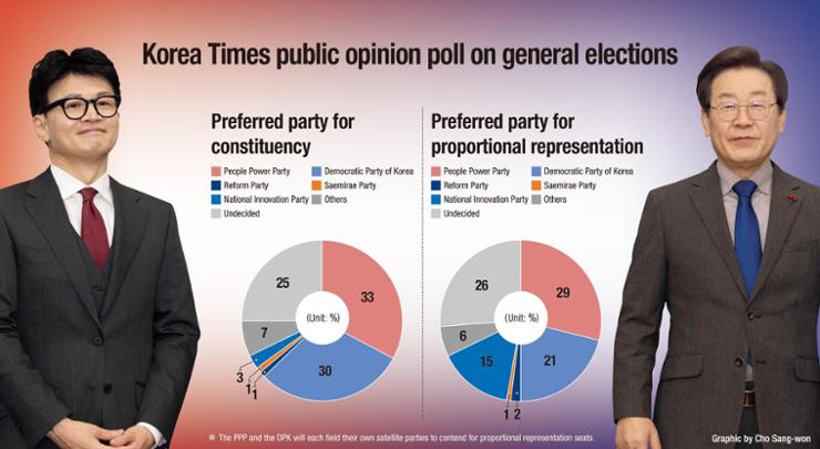 한국일보의 여론조사에 따르면, 4월 10일 총선에서 집권당인 피플파워당(PPP)이 제1야당인 민중민주당(DPK)을 오차범위 내에서 근소한 차이로 앞서고 있는 것으로 나타났으나 상당수의 유권자가 지지 정당을 결정하지 않은 것으로 나타났다.