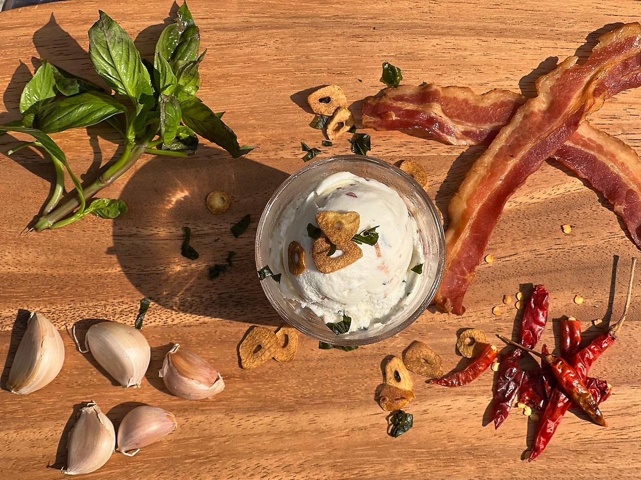 아이스크림뿐만 아니라 다른 디저트 메뉴도 다양하게 준비되어 있어요. 새로운 아이스크림 맛인 아글리오 에 올리오 위드 베이컨을 한 스쿱에 120홍콩달러(약 3.35달러)에 맛볼 것을 추천합니다. 이 아이스크림은 올리브 오일과 바질이 들어간 우유 베이스에 마늘, 말린 고추, 베이컨 조각을 넣어 만들었습니다.