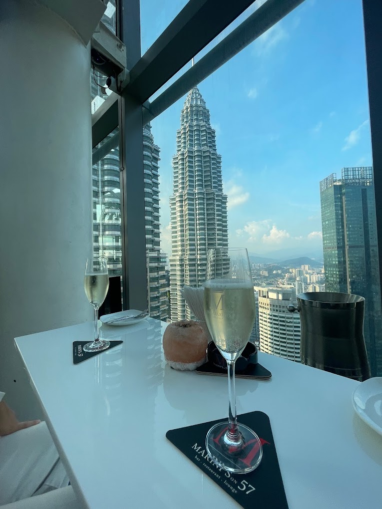 마리니스 온 57은 페트로나스 타워 3의 57층(수리아 KLCC와 인접)에 위치한 고급 이탈리안 리스토란테입니다. 식사 공간, 아르데코 가구와 네온 조명이 있는 바, 갈색 가죽 소파가 있는 하바나풍 라운지 등 세 개의 섹션으로 나뉘어 있습니다.